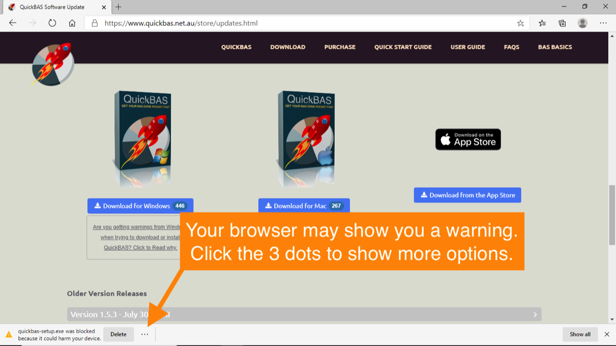 Are you getting warnings from your browser saying the QuickBAS download has been blocked?